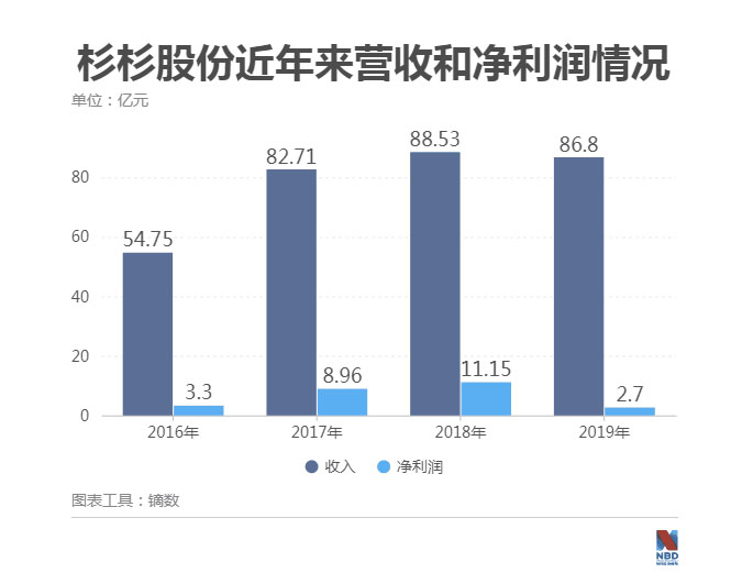 2019年,杉杉股份實現(xiàn)營業(yè)收入86.8億元,同比下降1.96%;扣非后凈利潤1.61億元,同比下降46.88%。其中,公司鋰電材料實現(xiàn)營收67.91億元,占公司主營業(yè)務收入的79.92%。