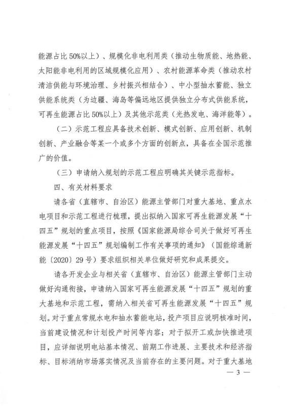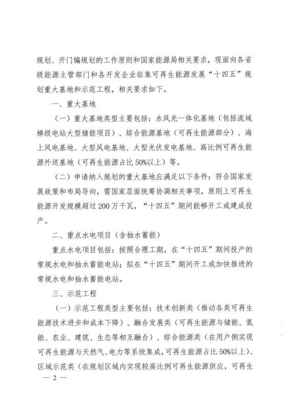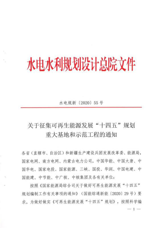 水電總院近日發(fā)布《關(guān)于征集可再生能源發(fā)展"十四五"規(guī)劃重大基地和示范工程的通知》,其中包含梯級電站大型儲能項目重大基地項目、抽水蓄能電站項目、新能源發(fā)電側(cè)儲能、新能源發(fā)電與氫能融合發(fā)展類項目等可參與申報。詳情如下: