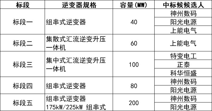 近日,中廣核新能源2020年第一批逆變器集采發(fā)布中標候選人公示,根據(jù)招標公告,本次集采共分為5個標段,規(guī)模共計480MW。其中,一、四、五標段的第一中標候選人為神州數(shù)碼(華為),規(guī)模共計320MW;第二標段規(guī)模60MW,僅有一位中標候選人,為上能電氣;三標段規(guī)模100MW,第一中標候選人為特變電工。