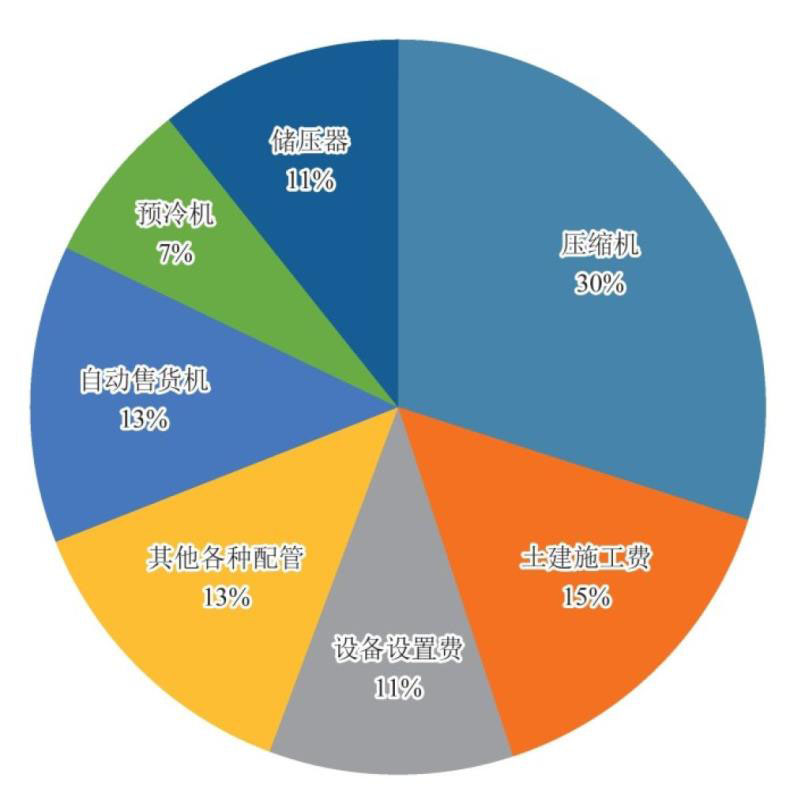 加氫站的主要設施包括儲氫裝置、壓縮設備、加注設備和站控系統(tǒng)等。目前一個加氫站的建設成本介于 200萬~ 500萬美元,其中壓縮機成本最高,約占總成本的 30%(圖 9)。中國加氫站的建設成本 相對較低,介于 200萬~ 250萬美元(35 MPa 加氫能力)。因此,需加快工業(yè)氫氣壓縮機國產(chǎn)化進程,降低加氫站建設成本,促進氫工業(yè)的發(fā)展。