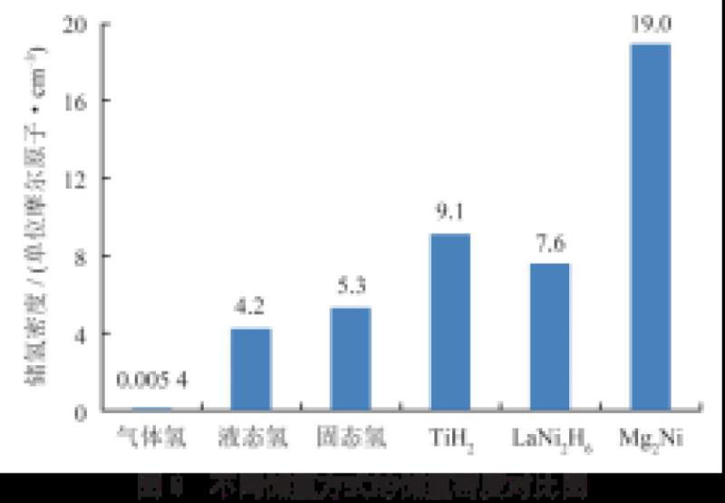 安全、高效的儲運氫技術是實現(xiàn)氫能實用化的關鍵[6-7]。氫能的存儲方式主要包括低溫液態(tài)儲氫、高壓氣態(tài)儲氫、固態(tài)儲氫和有機液態(tài)儲氫等,不同的儲氫方式具有不同的儲氫密度,其中氣態(tài)儲氫方式的儲氫密度最小,金屬氫化物儲氫方式的儲氫密度最大(圖 8)。