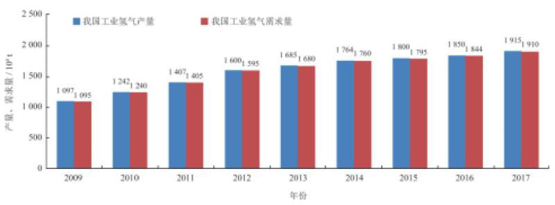 圖5 中國工業(yè)氫氣產(chǎn)量與需求量變化圖
