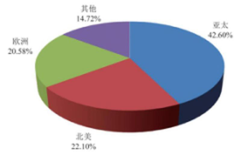 亞太地區(qū)工業(yè)氫氣生產(chǎn)量居全球首位,北美地區(qū)緊隨其后(圖 4)。2017 年亞太地區(qū)工業(yè)氫氣的生 產(chǎn)規(guī)模為1 071.36 億美元,北美為555.80億美元,而歐洲則為 517.57 億美元。中國和印度等亞太發(fā)展中國家經(jīng)濟快速增長,由此帶來了亞太地區(qū)對氫能等清潔能源的強勁需求。