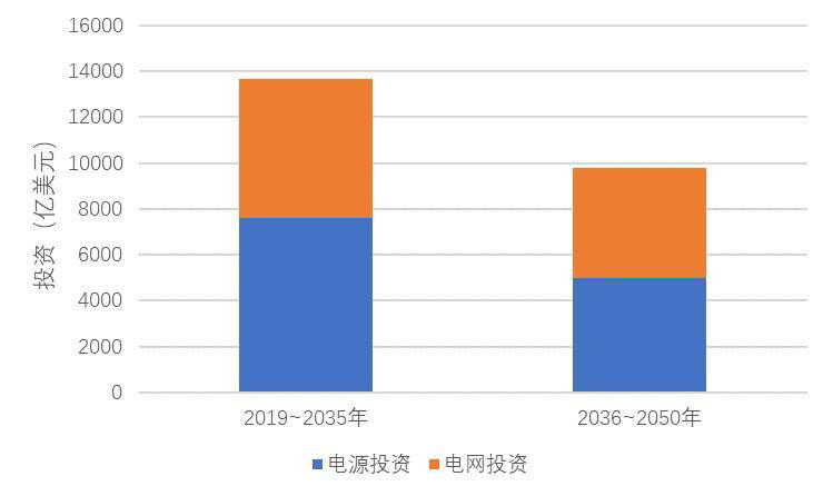 根據(jù)投資估算結(jié)果,到2050年,中南美洲能源互聯(lián)網(wǎng)總投資約2.35萬億美元,其中電源投資1.26萬億美元,占比54%;電網(wǎng)投資約1.09萬億美元。