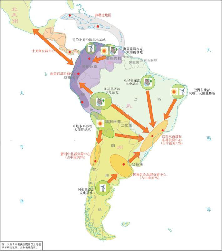 以巴西為中心的南美東部是中南美洲主要負(fù)荷中心;南美南部通過大規(guī)模開發(fā)水電、風(fēng)電和太陽能成為重要的電力送出基地;