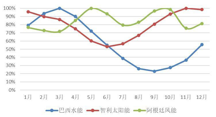 巴西水能、阿根廷風(fēng)能和智利太陽能年變化規(guī)律