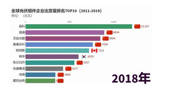 2019年全球組件制造商出貨量排名中,前十位中有八家為中國公司。其中,韓華Q-Cells位列第六,美國光伏巨頭First Solar位列第八。