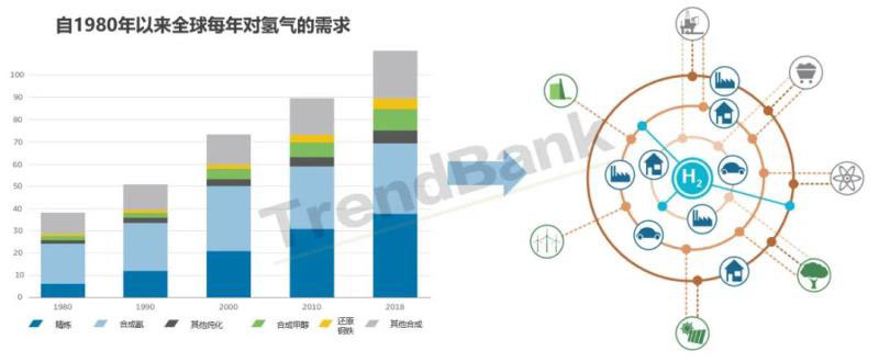 自1980年以來氫氣處在傳統(tǒng)精煉等領域需求量增加外在新興工業(yè)脫碳領域中的應用也在逐漸增加。