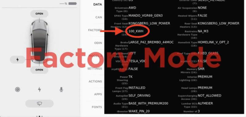 日前,另一名黑客“Zeus M3”在Twitter上表示,其進(jìn)入了特斯拉的工廠模式(Factory Mode),并且發(fā)現(xiàn)了100 kWh電池容量版本的Model 3。他還在Twitter上發(fā)布了這個(gè)工廠模式的截圖: