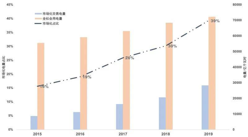 (一)市場交易比重不斷擴(kuò)大。自中發(fā)9號(hào)文發(fā)布至今,各省市有序放開發(fā)用電計(jì)劃,全國市場化交易電量快速攀升,比重不斷增加,如圖1所示。2019年全國電力市場交易電量已達(dá)約2.8萬億千瓦時(shí),同比增長28%,占當(dāng)年全社會(huì)用電量的39%。2019年6月27日《國家發(fā)展改革委關(guān)于全面放開經(jīng)營性電力用戶發(fā)用電計(jì)劃的通知》(發(fā)改運(yùn)行〔2019〕1105號(hào))的發(fā)布,標(biāo)志了市場化交易規(guī)模將會(huì)進(jìn)一步擴(kuò)大。