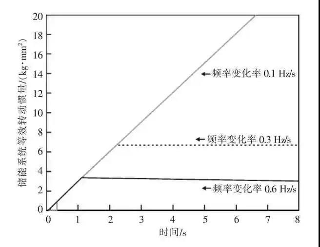 根據(jù)式(16),儲能系統(tǒng)提供最大功率后,在頻率變化率不變的情況下,儲能系統(tǒng)提供的轉(zhuǎn)動慣量和系統(tǒng)頻率變化率相關(guān),系統(tǒng)頻率變化率越小,儲能系統(tǒng)能夠提供更大的轉(zhuǎn)動慣量。