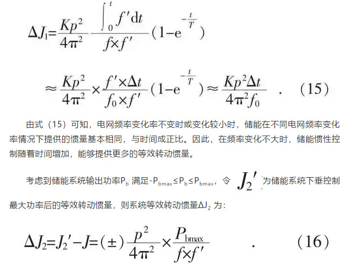儲能系統(tǒng)對電網(wǎng)輸出或吸收功率,通過功率交換實際上提供了系統(tǒng)額外等效慣量。根據(jù)轉(zhuǎn)子運動方程,計算了頻率變化時輸出功率和等效轉(zhuǎn)動慣量的關(guān)系。根據(jù)儲能系統(tǒng)典型控制方式,計算了不同控制方法下儲能系統(tǒng)等效轉(zhuǎn)動慣量的特性。