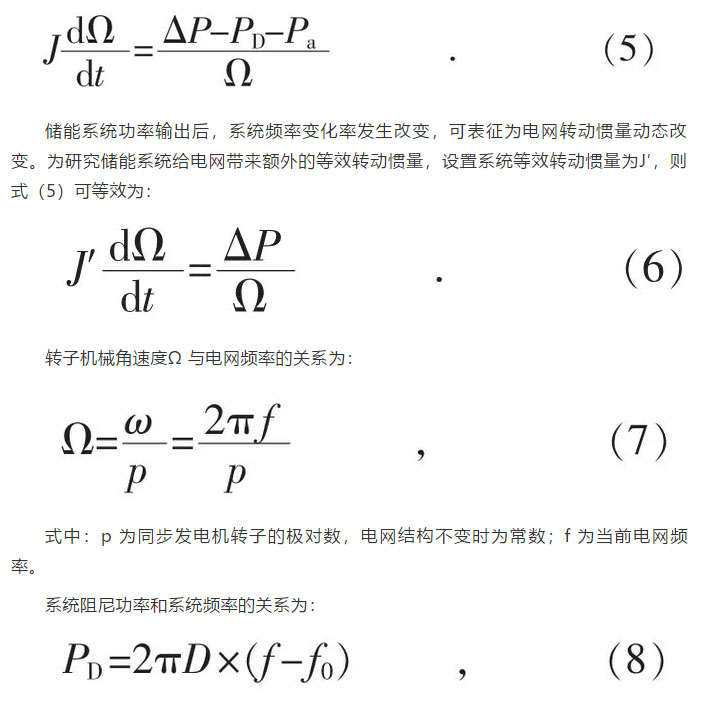 儲能系統(tǒng)接入電網(wǎng)中,輸出或吸收功率對電網(wǎng)頻率產(chǎn)生影響。在忽略負荷隨頻率變化特性、損耗和調(diào)速器等因素影響前提下,系統(tǒng)原有功率缺額不變的情況下,儲能系統(tǒng)能量輸出影響轉(zhuǎn)子動能(