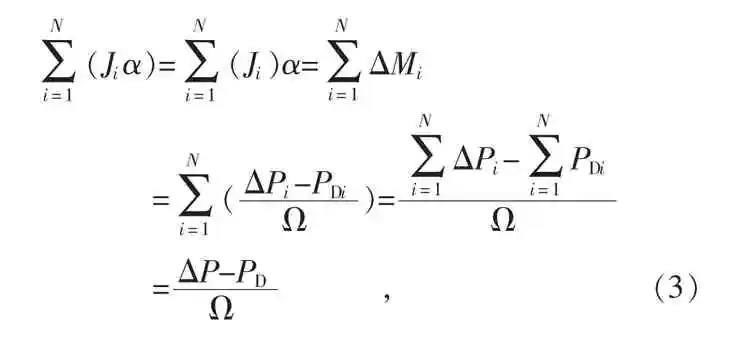 式中:N 為電網(wǎng)同步電機數(shù)量;Ji,ΔMi,ΔPi(i=1,2,…,N),PDi(i=1,2,…,N)分別為不同同步發(fā)電機的轉(zhuǎn)子轉(zhuǎn)動慣量、不平衡轉(zhuǎn)矩、不平衡功率和阻尼功率;ΔP 為系統(tǒng)不平衡總功率;PD 為系統(tǒng)總阻尼功率。