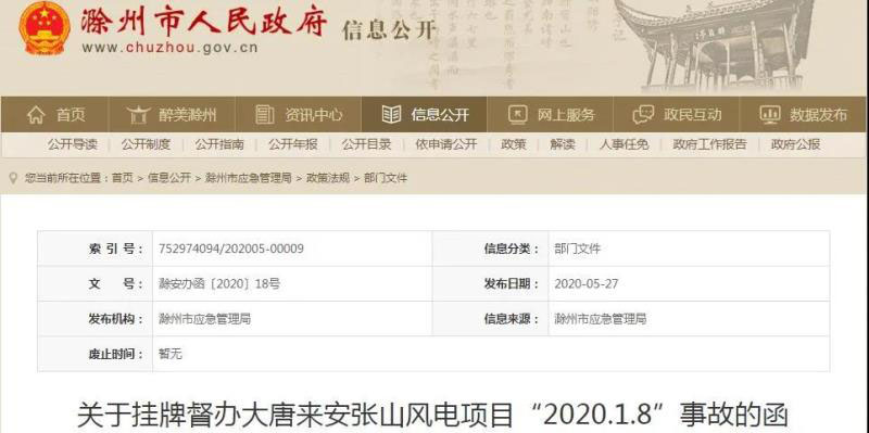 近日,滁州市人民政府發(fā)布《關于掛牌督辦大唐來安張山風電項目“2020.1.8”事故的函》。