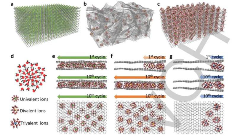 圖1 SCD最大化策略的示意圖。電池型材料a)中的裸離子和電容性材料b)中的溶劑化離子的典型配置 c)在HOPC中密集且整齊地溶劑化離子,可以實現(xiàn)超高SCD。d)水合陽離子的典型構(gòu)。緊湊型HOPC中第1和第10圈電化學(xué)活化后不同離子的分布:e)一價,f)二價和g)三價離子。
