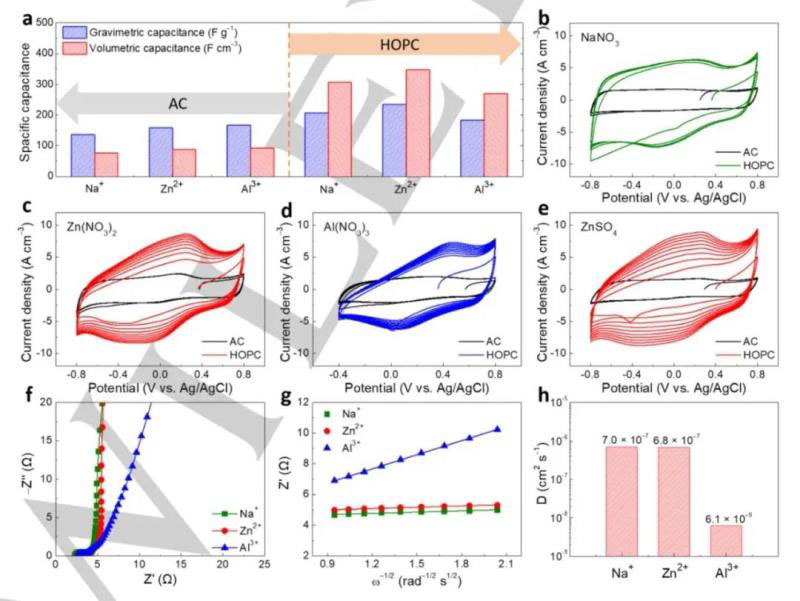 圖2 AC和HOPC中不同離子的電化學(xué)行為。a)AC和HOPC在1 A -1下的重量和體積電容。AC和HOPC在不同電解質(zhì)中的前十個CV曲線:b)NaNO3,c)Zn(NO3)2,d)Al(NO3)3,e)ZnSO4。HOPC在不同電解質(zhì)中的奈奎斯特圖f),在低頻區(qū)域g)中對應(yīng)于角頻率的真實電阻(Z')的線性圖以及導(dǎo)出的離子擴散系數(shù)h)。