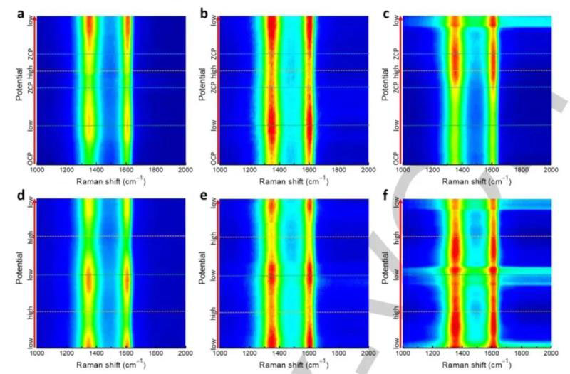 圖4 a-c)原始HOPC電極和d-f)活化的HOPC在不同電解質(zhì)中的原位電化學(xué)拉曼光譜:a,d)NaNO3;b,e)Zn(NO3)2;c, f)Al(NO3)3。