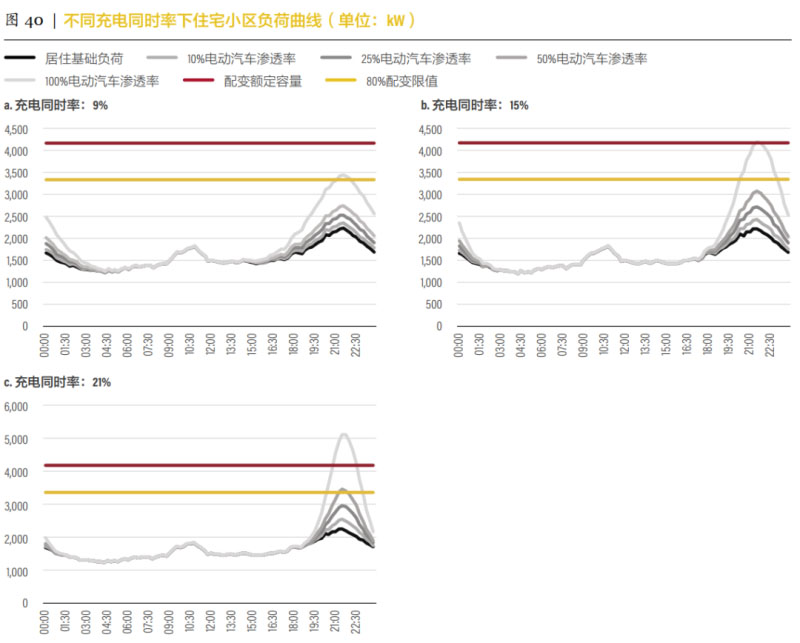 1.當車輛電動化比例超過25%、充電同時率超過20%,小區(qū)配變會重載;