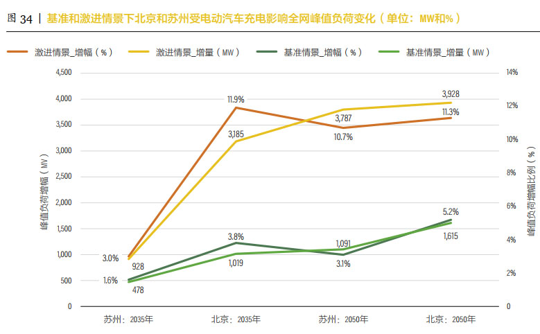從用電量來看,北京2050年激進情景下,電動汽車日用電量約占北京全社會用電量的10.9%;基準情景下占比約為5.0%;蘇州2050年激進情景下,電動汽車用電量將占全社會用電量的8.6%,基準情景下的電動汽車用電量則占3.0%。