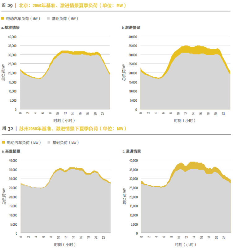 從夏季用電負荷來看(對比此前收集的夏季出行與充電數(shù)據(jù)),北京2050年激進情景下,疊加電動汽車充電后負荷峰值提高3928MW,相當于五個800MW裝機容量的發(fā)電廠滿負荷出力,日負荷的峰谷差繼續(xù)擴大;而蘇州同樣條件下,負荷峰值提高3787MW。