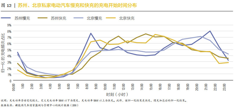 在報告選擇的八個城市中,私家電動汽車的起始充電時間規(guī)律大致上相同,但是受到不同城市工作時間、峰谷電價差、充電樁配套完善程度等因素的影響,起始充電時間在細節(jié)上有所差異:蕪湖的起始充電時間集中在早晨7點到9點之間,表明居民是在達到辦公地點后開始充電;而蘇州、南京、廈門和臨沂的起始充電時間在集中在下午17點到晚上20點,是下班后開始充電;而北京、上海、深圳等則是集中在晚上20點之后,尤其深圳的高峰期在晚上23-24點。