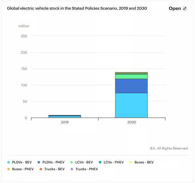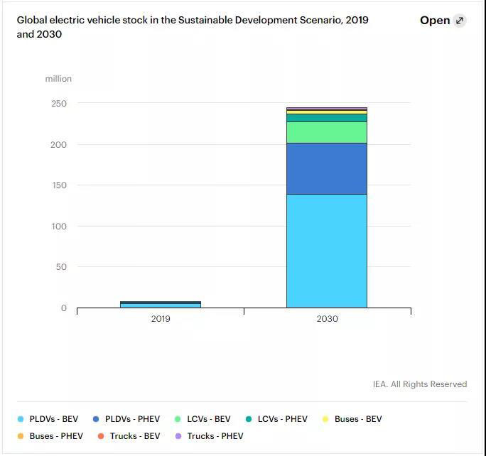 根據(jù)《報告》,未來十年,在既定政策下,全球電動汽車保有量接近1.4億輛,占全球汽車保有量的7%;但在“可持續(xù)發(fā)展情景”下,全球電動汽車保有量預(yù)計每年將增長36%,到2030年,達(dá)到2.45億輛,即目前水平的30多倍,其中,輕型車市場增長將最為強勁。