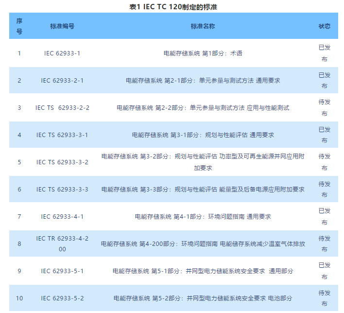 除IEC TC 120外,其他TC也制定了儲(chǔ)能相關(guān)標(biāo)準(zhǔn),比如IEC 62909-1雙向并網(wǎng)換流器 第1部分:一般要求、IEC 62619工業(yè)用二次鋰電池和電池組、IEC 61427-1 可再生能源儲(chǔ)能用蓄電池和蓄電池組 第1部分:光伏離網(wǎng)應(yīng)用、IEC 61427-2 可再生能源儲(chǔ)能用蓄電池和蓄電池組 第2部分:并網(wǎng)應(yīng)用等。