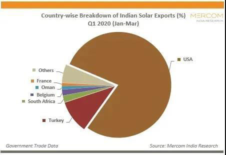 在2019-20財(cái)年,該行業(yè)看到了印度太陽能出口的增長,特別是對(duì)美國的出口。印度向美國出口占比接近81%,其次是土耳其(4.5%)和比利時(shí)(3.2%)。相比之下,印度在2018-19財(cái)年向美國出口了約44%的產(chǎn)品。