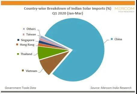 2020年第一季度,印度大部分太陽能進(jìn)口來自中國,占79%,其次是越南,占9%,泰國,占7%。較之2019年第四季度,中國進(jìn)口產(chǎn)品的份額已經(jīng)從85%降至79%。