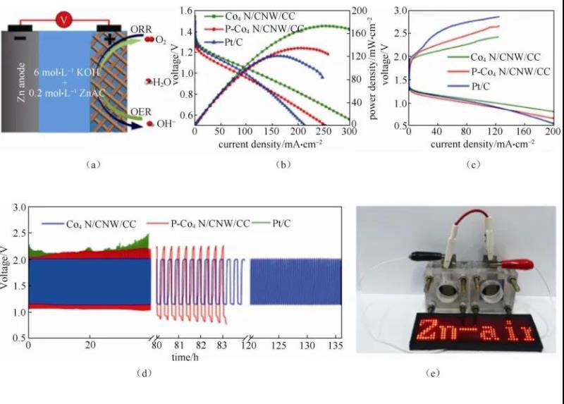 圖6 Co4N/CNW/CC雙功能電極在電化學(xué)可充電鋅-空氣電池中的應(yīng)用