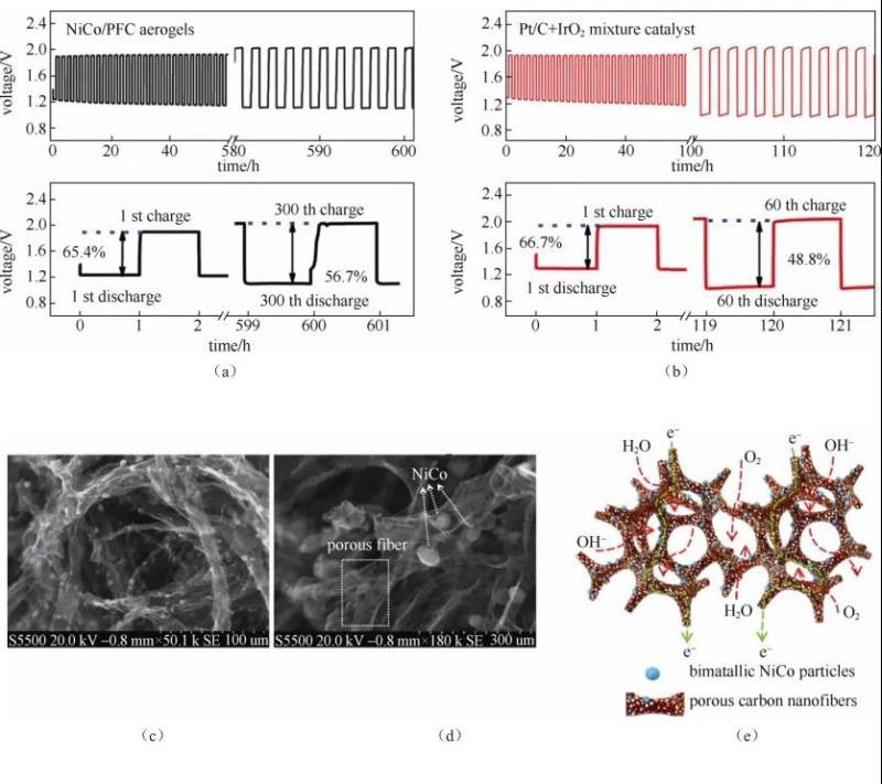 為了進(jìn)一步提高雙功能催化劑的活性,第三種方法是將具有OER活性的過渡金屬氧化物直接生長在具有ORR活性的碳基材料上,利用過渡金屬氧化物與碳基材料的協(xié)同效應(yīng),進(jìn)一步提高材料性能。一般認(rèn)為過渡金屬物種有較好的OER活性,但缺乏ORR活性,同時異原子摻雜的石墨化碳材料被證明有較好的ORR性能,但是在OER較高的氧化條件下存在熱力學(xué)不穩(wěn)定的問題。因此,研究者將兩種材料結(jié)合,發(fā)展了很多制備混合式雙功能催化劑的方法。如CHEN等設(shè)計了一種核-電暈結(jié)構(gòu)的雙功能催化劑,以具有OER活性的鈣鈦礦LaNiO3為核,通過化學(xué)氣相沉積的方法,將具有ORR活性的摻雜氮的碳納米管(NCNT)沉積到LaNiO3上,得到LaNiO3/NCNT催化劑。鋅-空氣電池充放電循環(huán)測試結(jié)果顯示LaNiO3/NCNT的穩(wěn)定性明顯優(yōu)于Pt/C,并且在18 mA/cm2電流密度下,經(jīng)過75個充放電循環(huán)(每個循環(huán)10 min,其中充電5 min、放電5 min)之后,電壓出現(xiàn)約0.2 V的衰減極化現(xiàn)象。Co3O4有較好的OER活性,ORR活性一般很差。LIANG等將Co3O4納米粒子生長在氮摻雜的石墨烯片層上,得到的混合型催化材料由于兩種組分間的協(xié)同效應(yīng),在6 mol/L的KOH中表現(xiàn)出優(yōu)異的ORR活性,并且Co3O4的OER活性也進(jìn)一步得到了提高。Co3O4/N-rGO這種催化劑是目前最優(yōu)異的雙功能催化劑之一。PRABU等利用水熱法,將CoMn2O4修飾到氮摻雜還原型氧化石墨烯上,初始的充放電電壓差為0.71 V,100次循環(huán)后電壓差為0.86 V。另外,在20 mA/cm2電流密度下經(jīng)過100個充放電循環(huán)(每個循環(huán)充電5 min、放電5 min)之后,電壓出現(xiàn)0.2 V的衰減極化現(xiàn)象,在實驗條件下,穩(wěn)定運行了約16 h。近來,也有一些其它類型的雙功能催化劑發(fā)展起來,鋅-空氣電池的充放電性能都有提高。如FU等采用一種新型的K2Ni(CN)4/K3Co(CN)6殼聚糖水凝膠衍生的方法,得到了負(fù)載在多孔纖維碳凝 膠上的NiCo納米粒子(圖4),NiCo/PFC這種雙功能催化劑表現(xiàn)出很好的催化活性。RDE數(shù)據(jù)顯示這種催化劑的ORR性能優(yōu)于Pt/C,OER性能優(yōu)于IrO2/C。在鋅-空氣電池循環(huán)穩(wěn)定性測試中, 10 mA/cm2電流密度下經(jīng)過300個充放電循環(huán)(每個循環(huán)2 h,其中充電1 h、放電1 h)之后,電壓出現(xiàn)0.07 V的衰減極化現(xiàn)象,穩(wěn)定運行了約600 h,性能十分穩(wěn)定。WANG等合成了負(fù)載在B、N共摻雜介孔納米碳材料上的Co(II)1-xCo(0)x/3Mn(III)2x/3S催化材料,鋅-空氣電池放電性能與Pt/C催化劑十分相似,充電電壓約為1.9 V,低于其它報道的可充電鋅-空氣電池結(jié)果,如MnO2/Co3O4(超過2 V)和LaNiO3/NCNT(超過2 V),充放電循環(huán)測試結(jié)果顯示該材料21 h內(nèi)充放電性能十分穩(wěn)定。