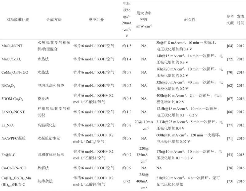 表2 可充電鋅-空氣電池雙功能催化劑