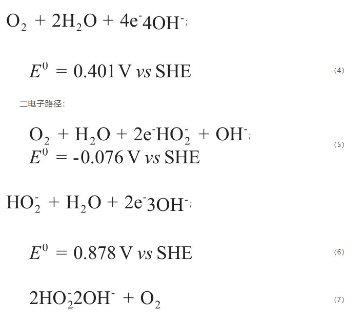 目前普遍認(rèn)為氧還原反應(yīng)(ORR)有兩種路徑:四電子路徑和二電子路徑。ORR在堿性介質(zhì)中的具體反應(yīng)如下所示。