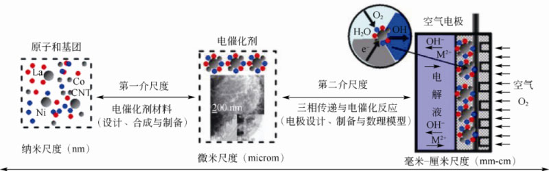 圖1 空氣電極過程的氣液固三相電催化反應(yīng)與跨尺度特征