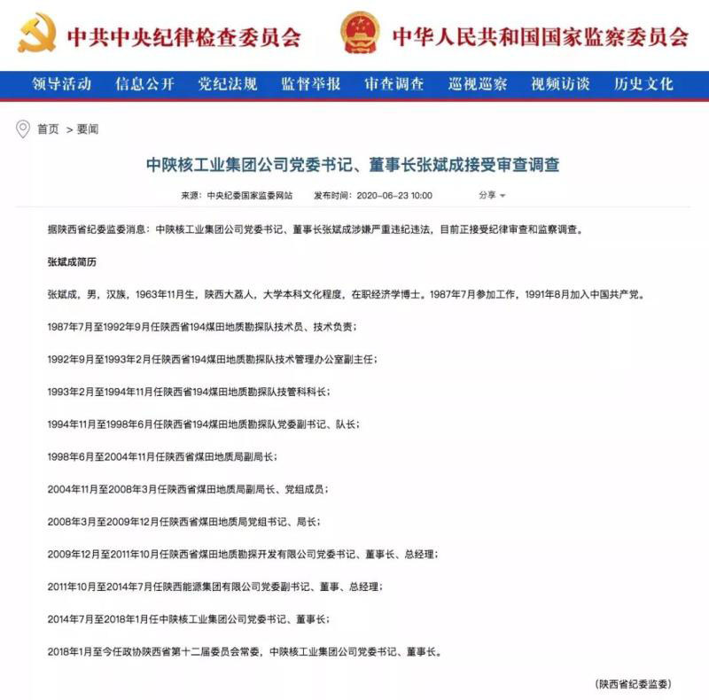 6月23日上午,中央紀委國家監(jiān)委網(wǎng)站援引陜西省紀委監(jiān)委又發(fā)出消息,中陜核工業(yè)集團公司黨委書記、董事長張斌成涉嫌嚴重違紀違法,目前也正接受紀律審查和監(jiān)察調(diào)查。