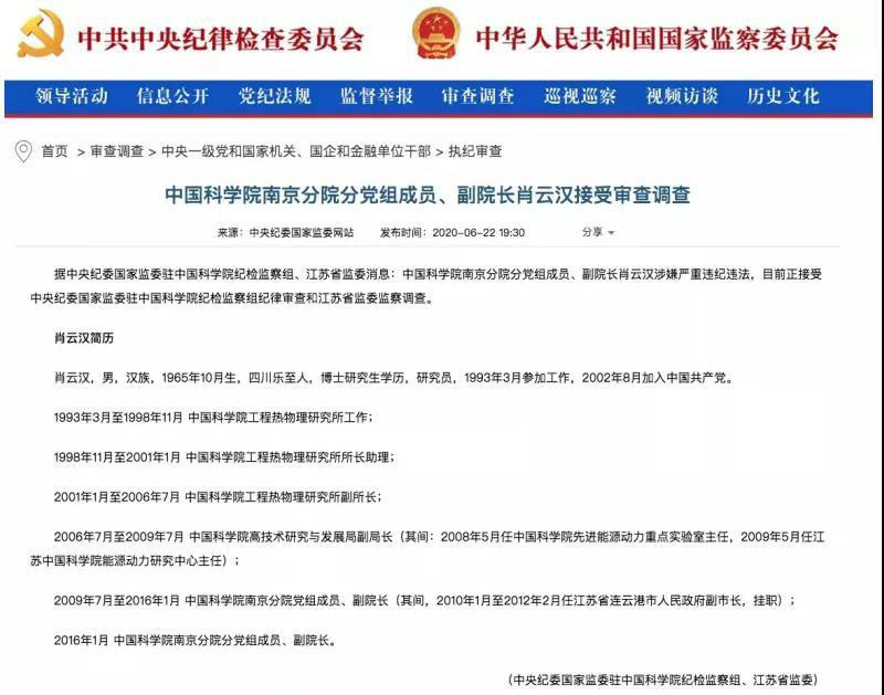 6月22日晚間,中央紀委國家監(jiān)委網(wǎng)站援引中央紀委國家監(jiān)委駐中國科學(xué)院紀檢監(jiān)察組、江蘇省監(jiān)委消息:中國科學(xué)院南京分院分黨組成員、副院長肖云漢涉嫌嚴重違紀違法,目前正接受中央紀委國家監(jiān)委駐中國科學(xué)院紀檢監(jiān)察組紀律審查和江蘇省監(jiān)委監(jiān)察調(diào)查。