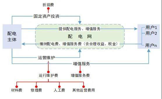 配網(wǎng)運(yùn)營商在建設(shè)期和運(yùn)營期會發(fā)生固定資產(chǎn)投資(如變電站、開閉所、配電線路、用戶專項(xiàng)工程等),在運(yùn)營期需要對配電資產(chǎn)進(jìn)行日常運(yùn)營和維護(hù),同時(shí)對電力用戶提供增值服務(wù)、繳納增值稅等,整個(gè)過程都會產(chǎn)生成本和費(fèi)用。電力用戶為其享受的配電服務(wù)和增值服務(wù)所發(fā)生的成本買單,配電主體通過向用戶收取配電費(fèi)、增值服務(wù)費(fèi)彌補(bǔ)成本并獲得合理收益。增值服務(wù)費(fèi)與用戶享受的增值服務(wù)水平有關(guān),由配網(wǎng)運(yùn)營商向電力用戶單獨(dú)額外收取,不計(jì)入配電定價(jià)成本。