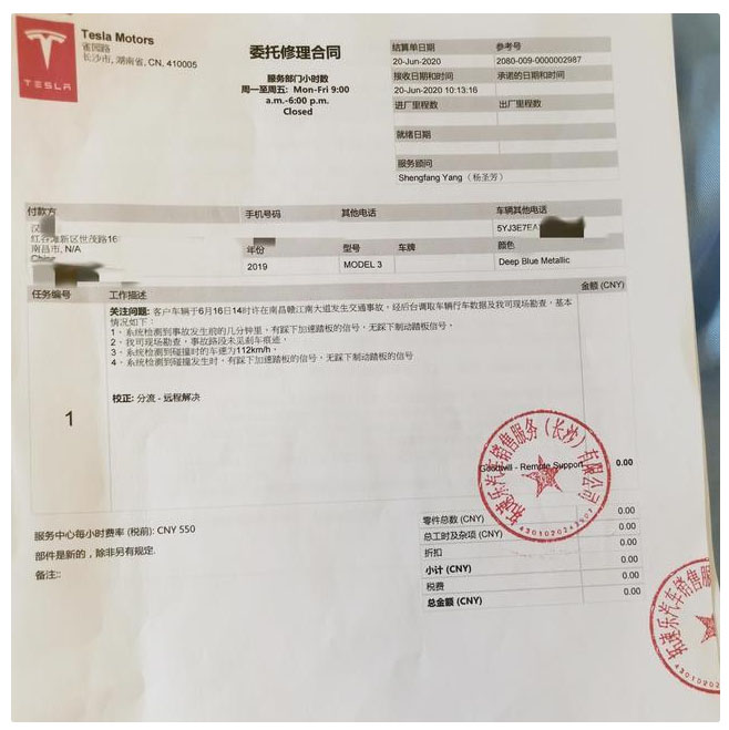 但特斯拉方面否認(rèn)了這次事故是由于Model 3失控且剎車失靈造成的。6月24日,特斯拉在給陳宇夫婦寄出的一份《委托修理合同》中稱,經(jīng)后臺(tái)調(diào)取車輛行駛數(shù)據(jù)及現(xiàn)場(chǎng)勘查情況為,系統(tǒng)檢測(cè)到事故發(fā)生前幾分鐘及碰撞時(shí),有踩下加速踏板的信號(hào),無踩下制動(dòng)踏板信號(hào);勘查現(xiàn)場(chǎng),事故路段未見剎車痕跡等。