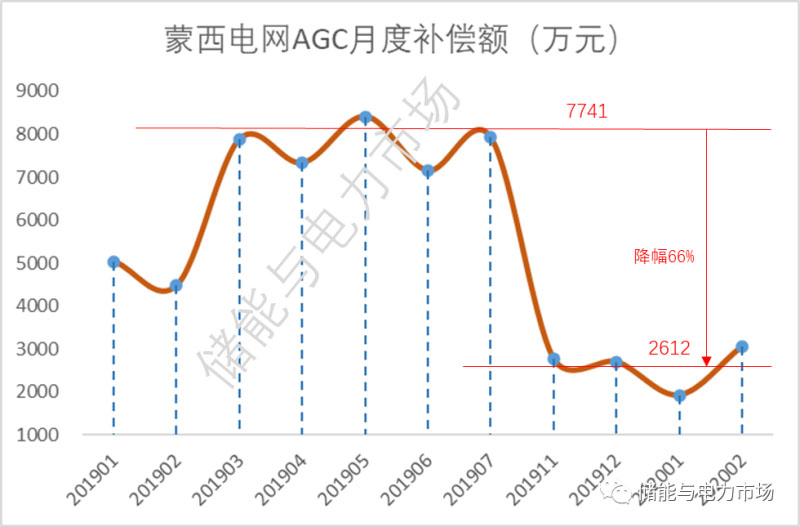 2019年11月,由于政策的微調(diào)和調(diào)度調(diào)用策略的調(diào)整,蒙西電網(wǎng)的AGC輔助服務(wù)突然降至2700萬,并持續(xù)保持在這一水平左右,近幾個月的補(bǔ)償平均值與2019年處于運(yùn)行高位時的各月份補(bǔ)償平均值相比,降幅高達(dá)66%。