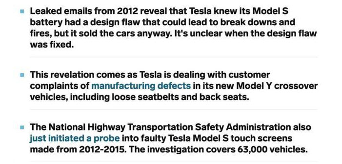 在馬斯克稱貝索斯是抄襲狗之前,外媒Business Insider在25日報道稱,大量泄露的特斯拉郵件顯示,其在2012年就知道Model S因電池設計不當,可能會導致短路甚至起火,但管理層為了產(chǎn)量和業(yè)績,選擇視而不見。
