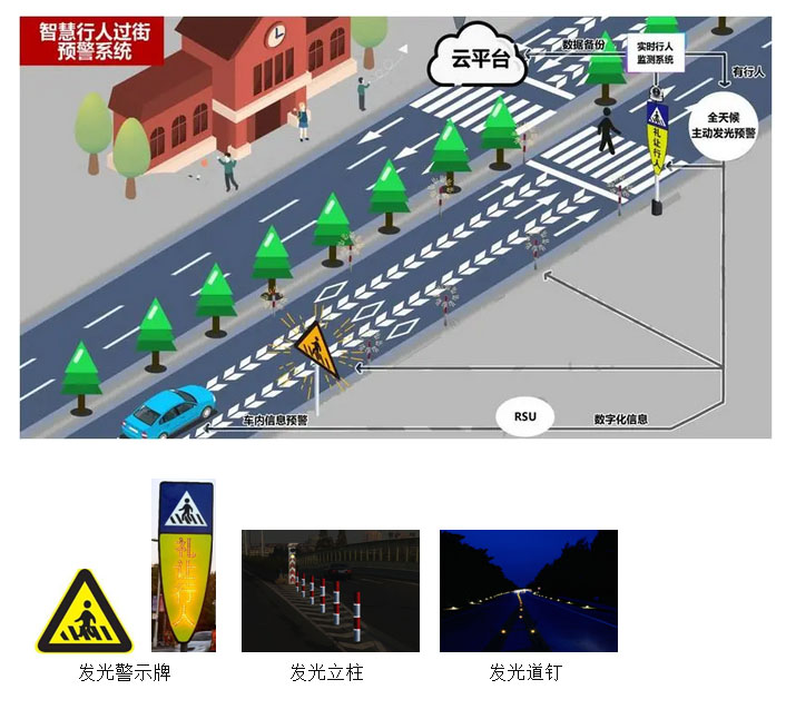 → 行人過馬路聲光警示:偵測到行人過馬路行為后聯(lián)動(dòng)發(fā)光警示牌、發(fā)光立柱、發(fā)光道釘閃爍,提醒駕駛員禮讓行人。
