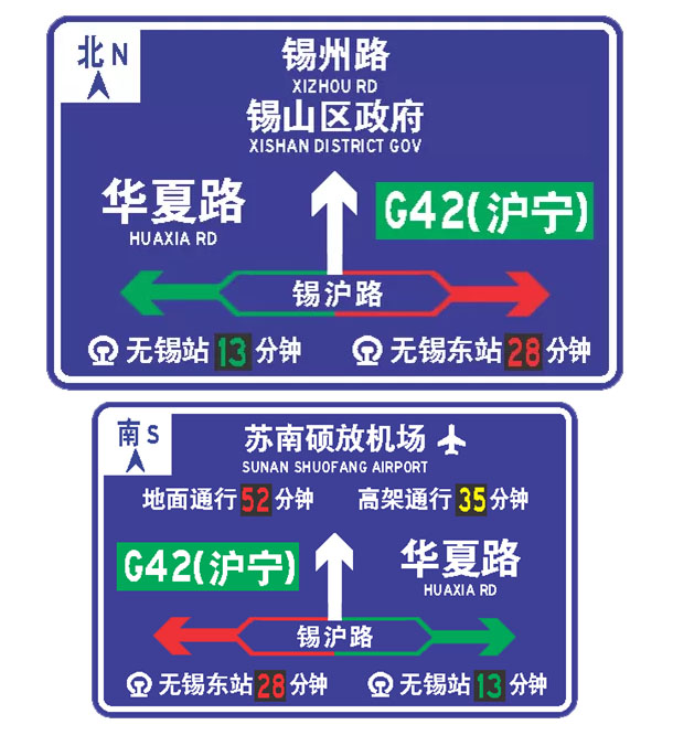 智慧交通誘導(dǎo)標(biāo)志牌采用全透式主動(dòng)發(fā)光標(biāo)志牌,實(shí)現(xiàn)整條道路標(biāo)志牌亮化;采用發(fā)光交通誘導(dǎo)可變信息標(biāo)志牌,結(jié)合高德地圖導(dǎo)航數(shù)據(jù),動(dòng)態(tài)分色顯示道路擁擠狀態(tài)、不同路徑到達(dá)“蘇南碩放機(jī)場”“高鐵東站”“無錫站”的時(shí)間,實(shí)現(xiàn)動(dòng)態(tài)誘導(dǎo)分流。