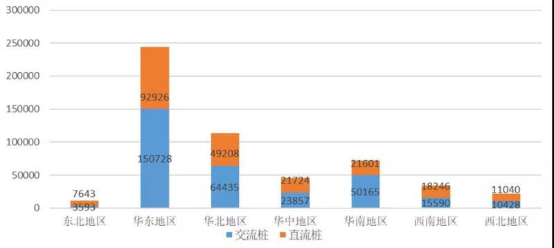 我國(guó)東北地區(qū)、華東地區(qū)、華北地區(qū)、華中地區(qū)、華南地區(qū)、西南地區(qū)和西北地區(qū)公共交、直流充電樁數(shù)量分布(見(jiàn)圖4)。