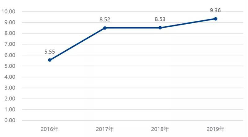2015~2019年新能源汽車(chē)總銷(xiāo)量與公共充電樁保有量比值維持在8上下,2016年后比值緩慢上升。2016年新能源汽車(chē)增量與公共充電樁增量的比值為5.55。2017年、2018年維持在8.5,進(jìn)入2019年上升到9.36。隨著充電市場(chǎng)的日趨成熟,運(yùn)營(yíng)企業(yè)已經(jīng)摒棄了跑馬圈地式運(yùn)營(yíng),開(kāi)始采取按需發(fā)展,適當(dāng)先行的策略,車(chē)樁增量比值在增大。