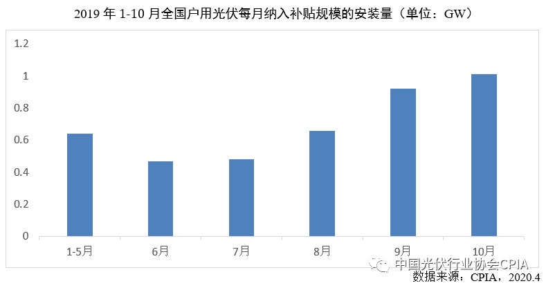 2019年全國戶用光伏市場呈“帽子”曲線形式波動:1-5月,戶用光伏市場延續(xù)2018年下半年的發(fā)展態(tài)勢,市場處于冷淡期;6-10月,隨著光伏發(fā)電項(xiàng)目管理政策落地實(shí)施,全國各地光伏企業(yè)及戶用經(jīng)銷商為搶占市場,積極開展戶用光伏業(yè)務(wù),戶用光伏市場快速恢復(fù)并迅猛發(fā)展;11-12月,由于規(guī)模指標(biāo)用完,戶用市場基本處于停滯狀態(tài)。2019年1-10月全國戶用光伏每月納入補(bǔ)貼規(guī)模的安裝量如下圖所示。2019年的戶用光伏裝機(jī)主要集中在6-10月,平均每月安裝量約為0.71GW。