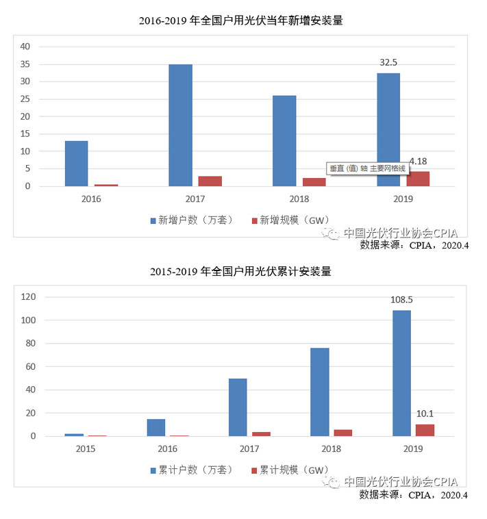 2019年,戶用光伏成為新增裝機(jī)中的亮點(diǎn)。根據(jù)國家能源局公布的數(shù)據(jù),2019年戶用光伏項(xiàng)目納入規(guī)模管理指標(biāo)中的新增裝機(jī)規(guī)模為5.29GW,其中包含2018年并網(wǎng)但未納入當(dāng)年國家規(guī)模管理的項(xiàng)目規(guī)模約為1.11GW,2019年實(shí)際新增裝機(jī)規(guī)模為4.18GW,同比增長74.2%。通過協(xié)會的調(diào)研數(shù)據(jù)測算,截至2019年底,戶用光伏項(xiàng)目累計(jì)裝機(jī)規(guī)模突破10GW,達(dá)到10.1GW;2019年全國戶用光伏項(xiàng)目新增戶數(shù)約為32.5萬套,同比增長約25%,累計(jì)安裝戶數(shù)超過百萬套,達(dá)到108.5萬套。