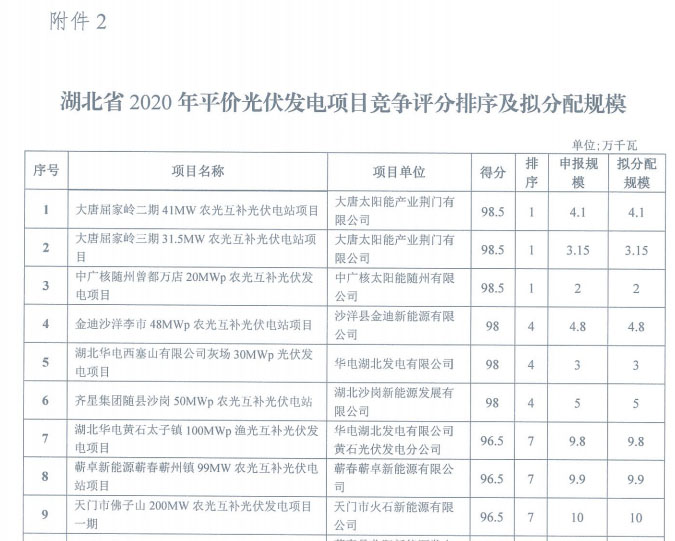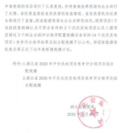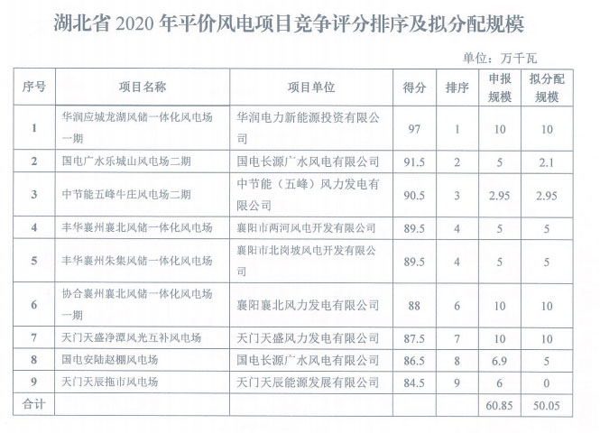 湖北省能源局關(guān)于公布2020年平價(jià)風(fēng)電和平價(jià)光伏發(fā)電項(xiàng)目競爭評分結(jié)果及擬分配規(guī)模的通知