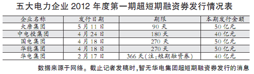 事實上,在今年3月15日超短期融資發(fā)行主體放寬至五大發(fā)電集團(tuán)后,華能便成為首家獲得注冊額度并批準(zhǔn)發(fā)行的企業(yè)。4月18日,中國華能集團(tuán)公司成功發(fā)行了其2012年度第一期50億元超短期融資券。該超短期融資券期限270天,票面年利率4.18%,綜合年成本率4.58%,比同期銀行貸款基準(zhǔn)利率低1.98個百分點。