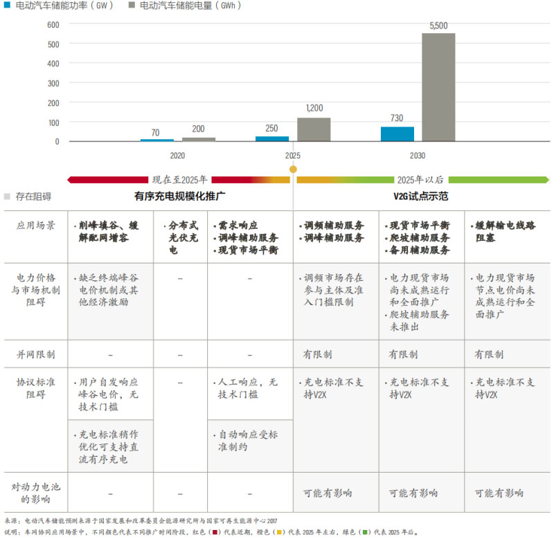 隨著電力市場改革釋放更多的紅利以及動力電池成本的下降與壽命的提升,電動汽車可進(jìn)而發(fā)揮其分布式電源的作用,結(jié)合微電網(wǎng)、虛擬電廠等試點(diǎn)平臺,以V2G方式提供調(diào)頻、調(diào)峰、現(xiàn)貨電力平衡、爬坡服務(wù),爭取在2025—2030年形成具有示范意義的項(xiàng)目與商業(yè)模式。